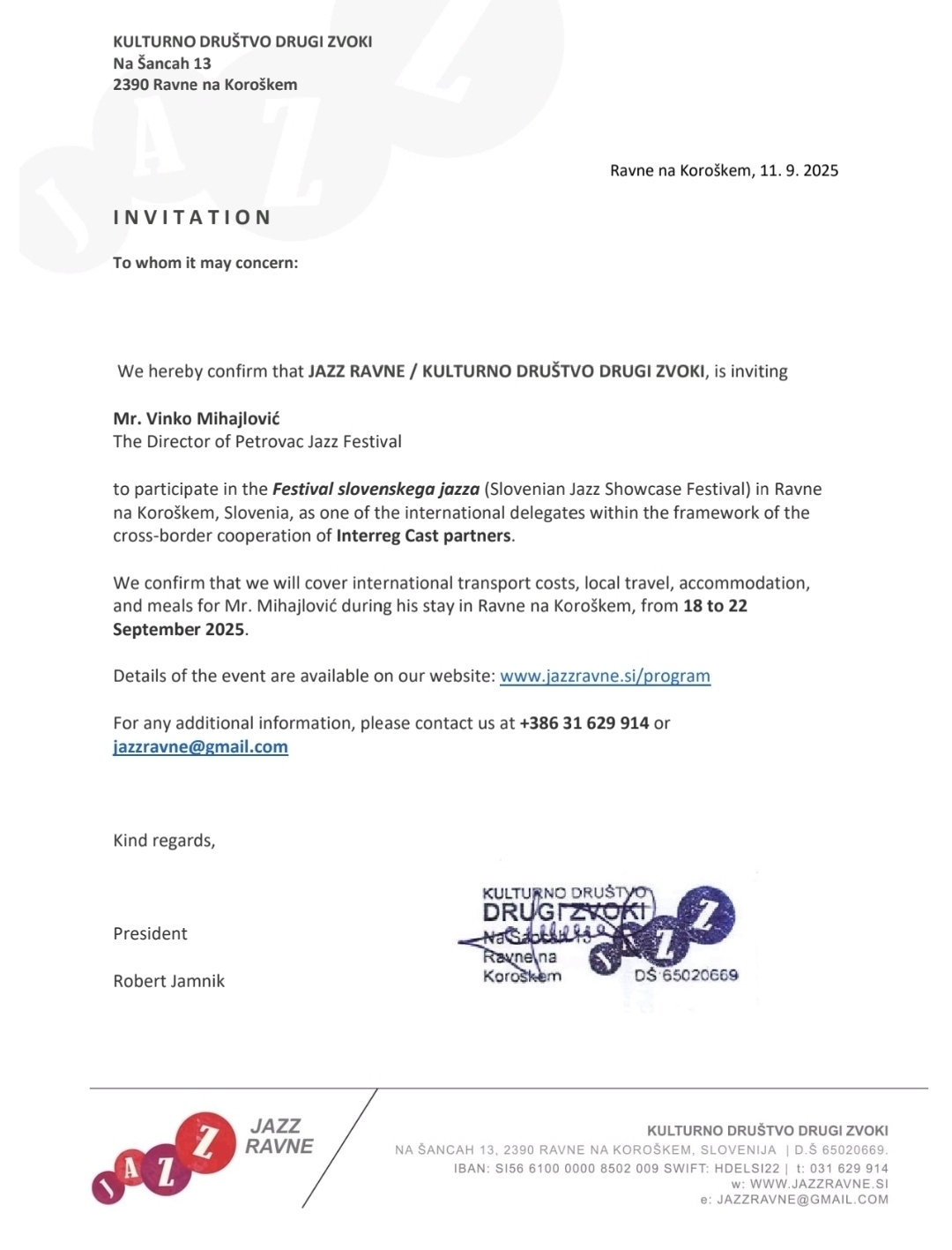 Pozvani smo na Festival slovenskog jazza (Slovenski Jazz Showcase Festival) u Ravnama na Koroškem, Slovenija, kao jedan od međunarodnih delegata u okviru